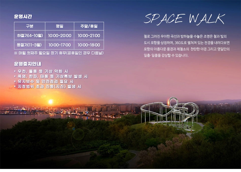 한국 안전관리사협회, 한국조엔지니어링에서 안전지침을 준수하였다니 안전하게 스페이스워크를 이용하실 수 있습니다. 아찔하고 짜릿한 스카이워크가 될 것입니다. 홈페이지를 통해 정상운영 관련해서 확인할 수 있습니다 (http://www.pohang.go.kr)