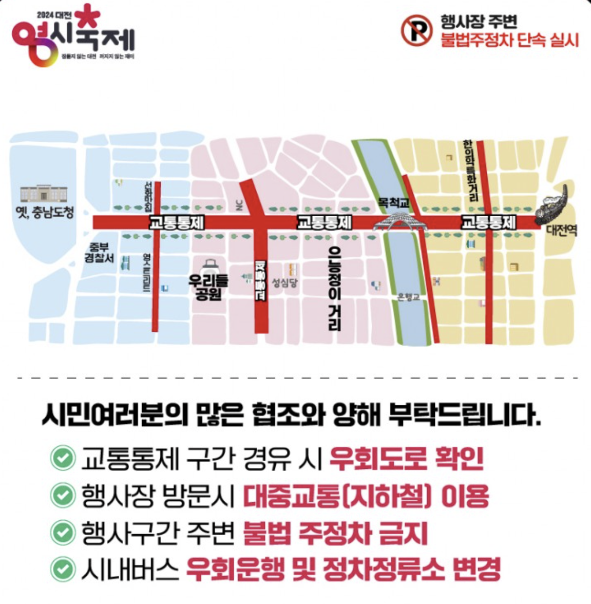 통제구간 : 중앙로(대전역~옛 충남도청)